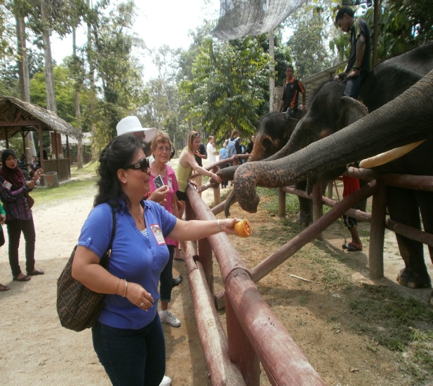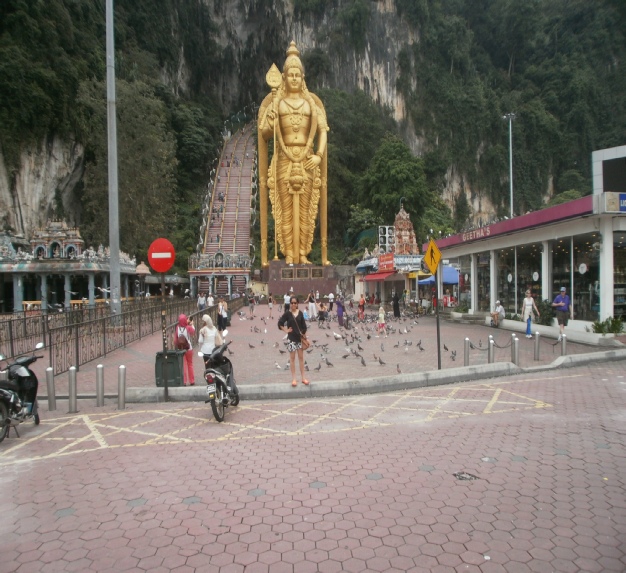 Joanne in front of Hindu statue Back of Hindu goddess statue very impressive Hindu statue at least 100 ft high Over 300 steps we climbed to get into the cave temple. Shattered Bill feeding monkey on steps Menara tower Kuala Lumpur 5th highest structure in the world Petronas towers Kuala Lumpur tallest twin tower in world Angela feeding elephant in a conservation park in malaysia Video of Joanne feeding elephants Video of Joanne washing baby elephant Joanne washing baby elephant in Malaysia Joanne in t-shirt she had to buy after getting wet washing the elephant