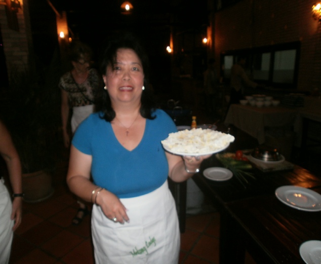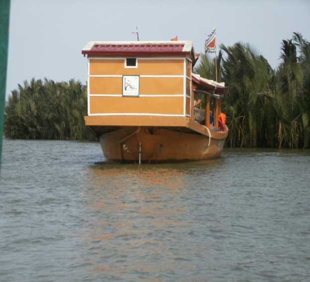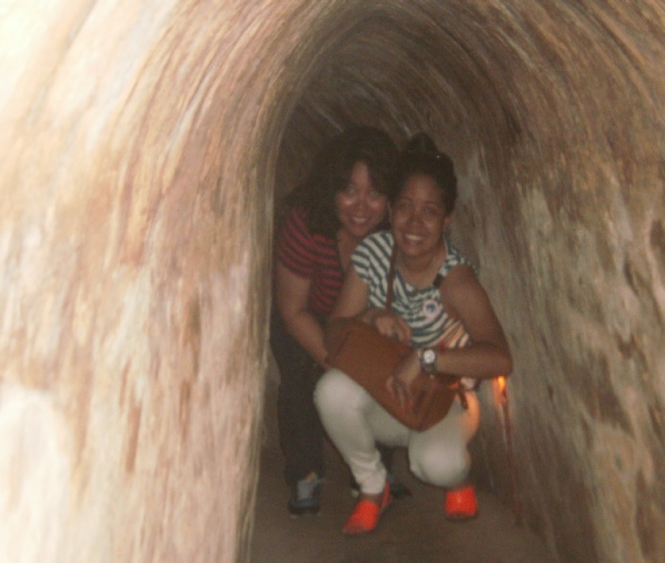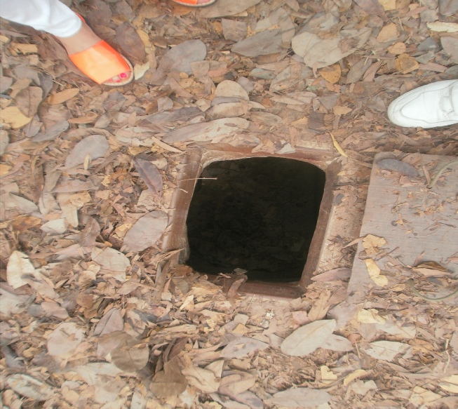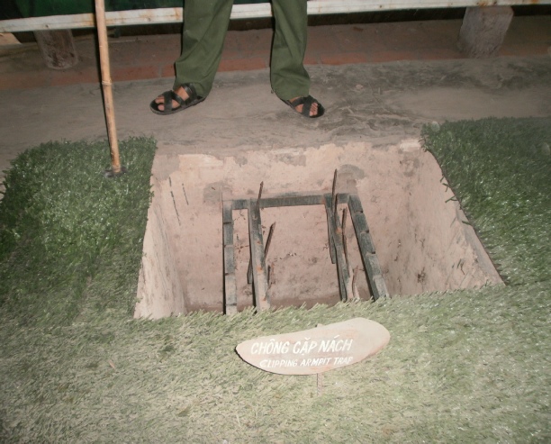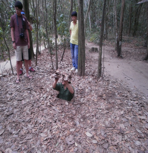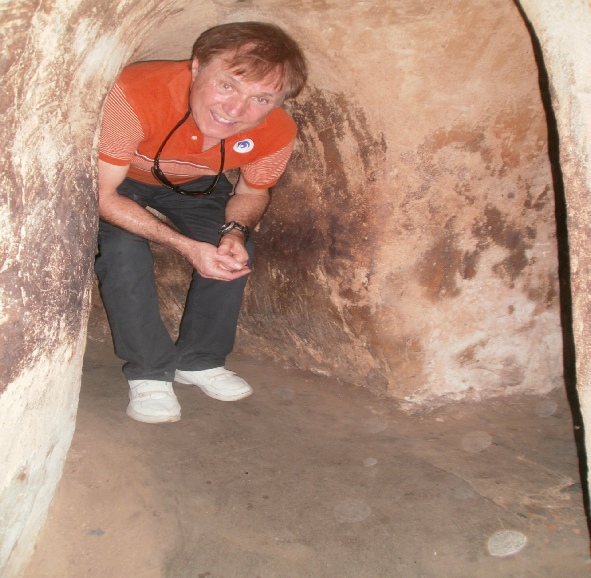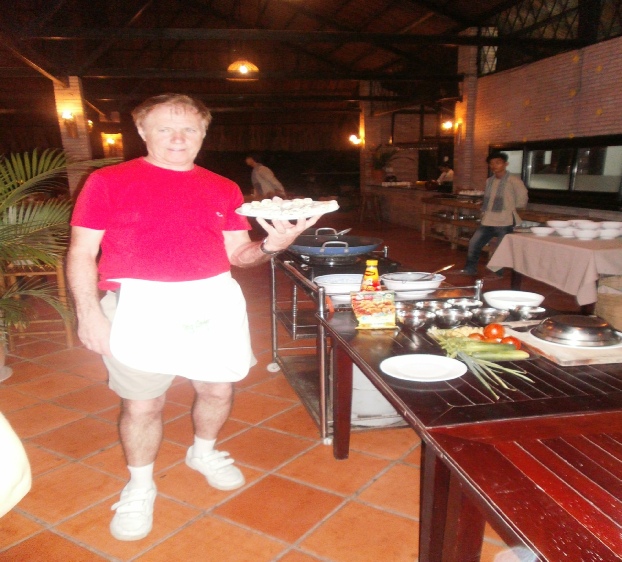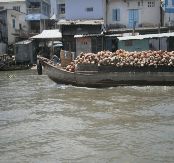 Coconuts on the way to market Toilet on a boat on the Mekong river Outside bathroom in the lodge we stayed in on the Mekong delta Outside toilet in lodge. Notice the door which rolls down We went to cooking class and what we made we had to eat later Chef bill with his cooking delight. Notice apron. Sexy Dinner at the Mekong lodge including the food we made at the cookery class Angela having a ride with tan Fairly large ship with dragon bow. Very scary Big ship in floating dry dock on the Saigon river Young captain of river ferry This is one of the entrances to the Viet Cong tunnels used in the war Angela entering specially enlarged entrance Man trying to get into tunnel the hole is only 2 feet square Joanne, Angela in tunnel these enlarged tunnels are 3ft square Bill in enlarged tunnel entrance for tourists Joanne eating typical Viet Cong meal of rice and boiled tapioca Viet Cong sandal made from old tyre. Brilliant Viet Cong booby trap which   killed a lot of americans Disabled people making items for sale. These shops were everywhere run by the government Video taken in a restaurant on the Saigon river. Notice greenery floating down river Lots of local made marble statues everywhere for sale Joanne on a keep fit swing in local park. Provided free of charge by government