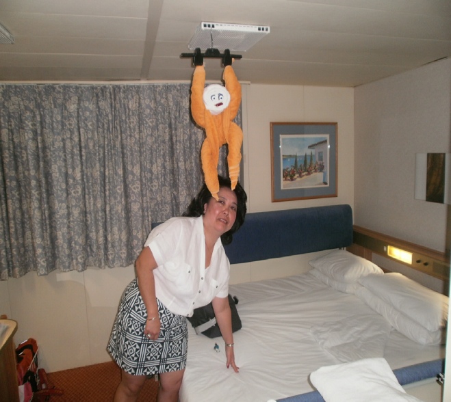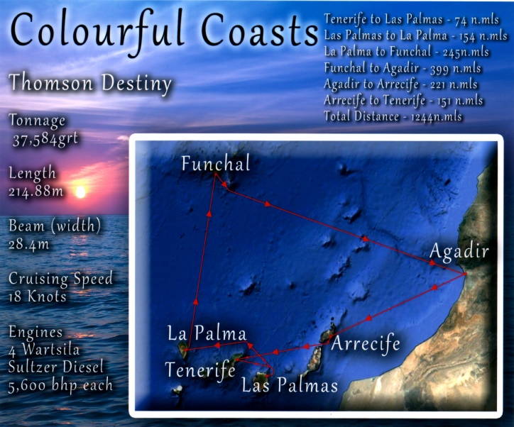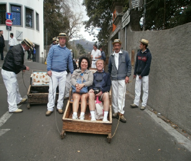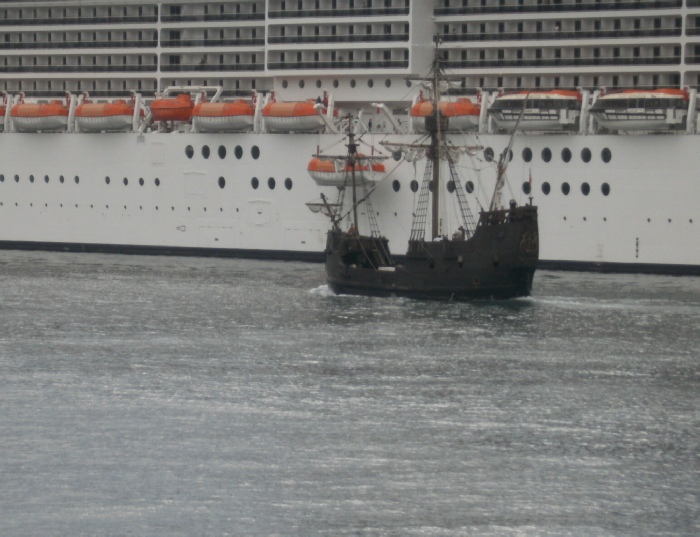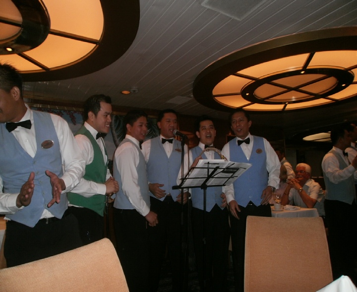 Map of cruise The waiters onboard who were brilliant Photo taken in casual clothes About to meet the captain These figures were made out of marzipan by the chef Angela monkeying about No we did not do the can can The captain, admiral, Angela and A.N. other Our lives in their hands as we start the At the bottom in two pieces Taxi behind. They will do anything to get clients This ship is similar to the one Columbus sailed in